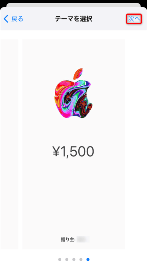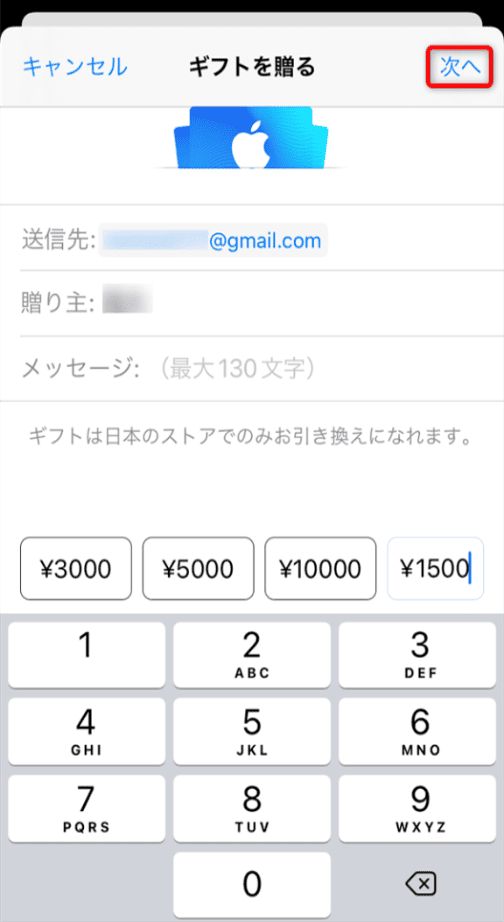 ギフトを贈る送信先のメールアドレス・送り主の名前・メッセージ(任意)・金額などの設定をおこない「次へ」を選択。